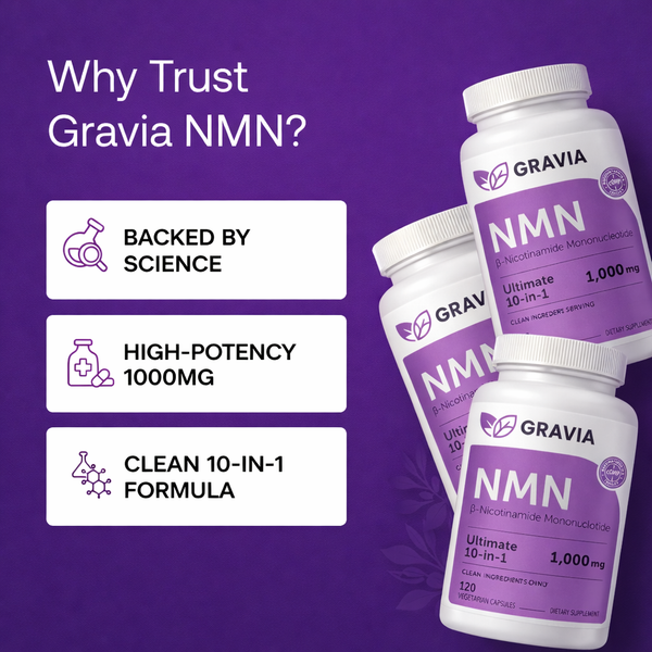 That’s why Gravia uses NMN (a direct precursor to NAD+) — paired with a supportive 10-in-1 stack — to help your body maintain NAD+ levels over time.